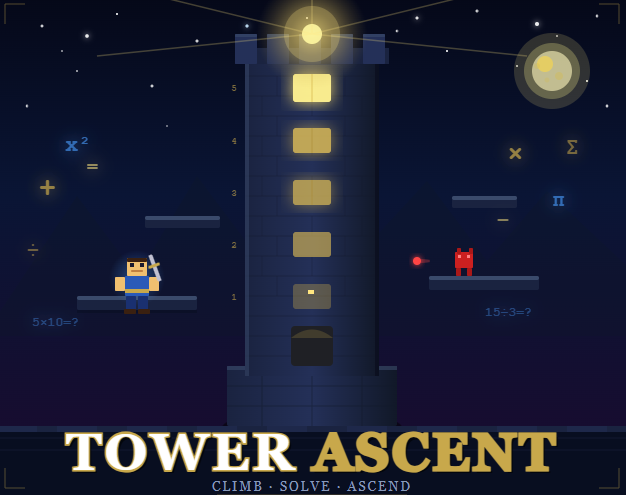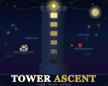Tower Ascent is a 2D platformer where knowledge is your most powerful weapon. You play as Kael, a student who must climb a sealed five-floor tower to free an imprisoned Sage and restore knowledge to the world outside. Each floor is filled with enemies, spike traps, gravity zones, and moving platforms standing between you and the exit. But raw skill alone will not get you through. Scattered throughout every floor are math puzzles that gate your most valuable powerups. Answer correctly and earn invincibility, a full heal, or a double jump to push through the next section. Get it wrong and lose points. Every decision feeds into a knowledge point system that tracks your performance across the whole run, rewarding players who fight smart and think fast. Collect one hidden painting fragment per floor, clear all five, and unlock the true ending. Upgrade your health, speed, and jump height between runs using points earned in the tower.